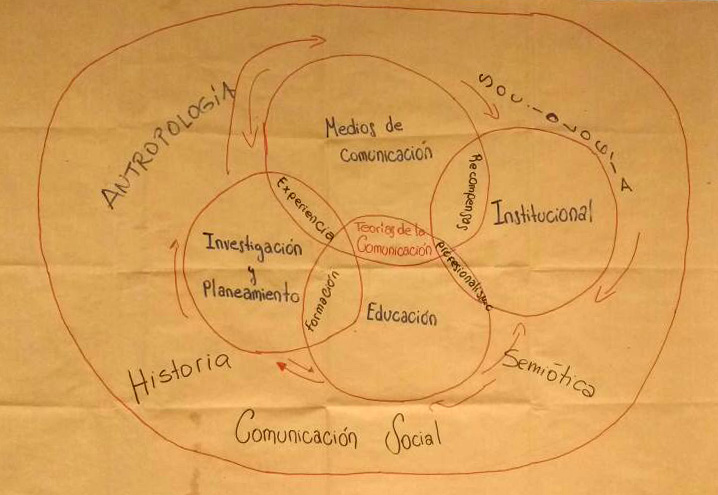 La tarea siguiente fue bosquejar en un afiche las tribus y territorios académicos de la Comunicación Social y el campo educativo. Posteriormente cada grupo compartió su producción con el resto de la clase.